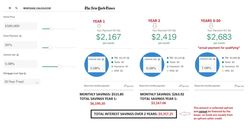 The idea is this: if current rates are scaring off buyers, the seller of a property can incentivize prospective buyers by offering to reduce their rate for the first two years of the loan. Observe: