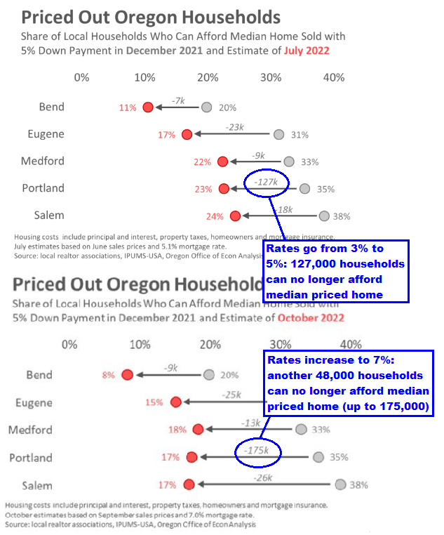 That’s not good! Looking at Portland Metro alone, 175,000 households were priced out of buying a median priced home between December 2021 and October 2022 given that rates went from 3% to 7%.