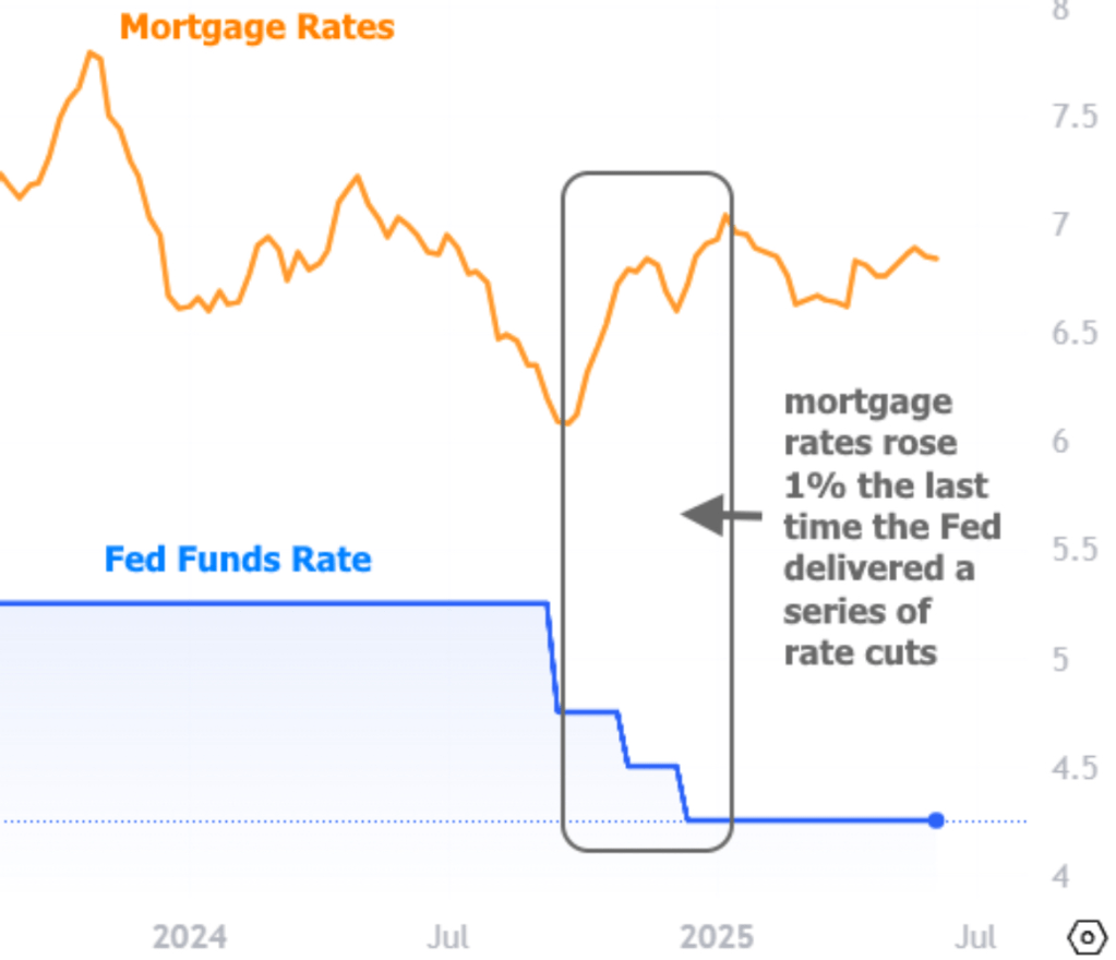He says this over, and over, and over again. There’s just one problem: that’s not how mortgage rates work, and cutting the Fed Funds Rate can potentially lead to higher mortgage rates. Want proof? Here’s what happened when the Fed cut interest rates by a total of 1% between September and December of 2024.